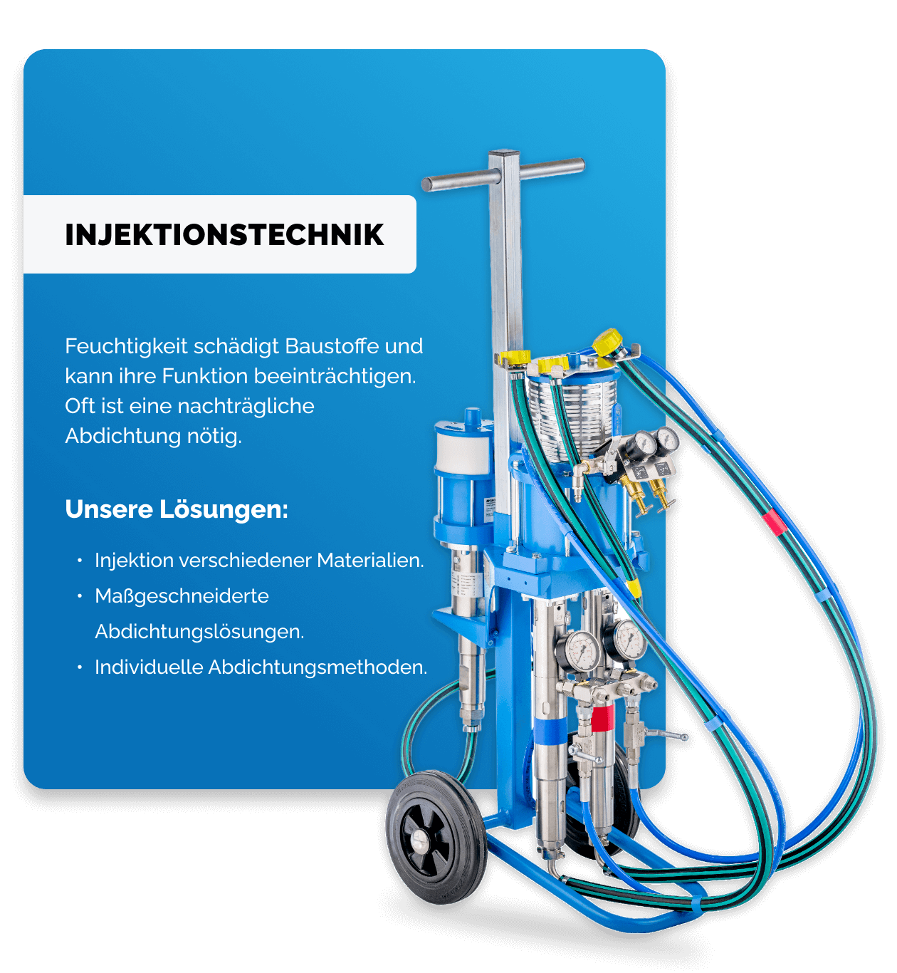 Wir sind Ihr Spezialanbieter wenn es um Maschinentechnik und Zubehör für die Abdichtung und Beschichtung von Bauwerken im Neubau und Bestand geht. Von Injektionspumpen für die Horizontalsperre und Rissverpressung, bis hin zu 2K-Anlagen für die Abdichtung und Beschichtung von Bauwerken.